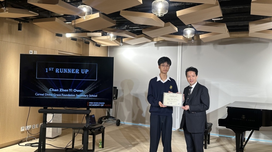 25 Oct, 2025S.6C Chan Zhen Yi Owen achieved remarkable success in the 2nd HKBU Secondary School Songwriting Competition organised by The Academy of Music, HKBU, where he was awarded the First Runner-up. His inspiring composition, Perfectionist, encourages individuals to embrace their true selves, imperfections and all. We are delighted to see Owen's creativity and artistic talents beautifully showcased.