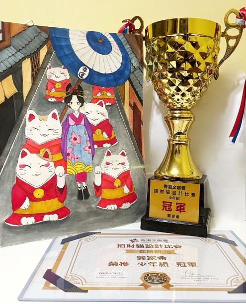 In November 2021, S1 Kung Ka Hei took part in the “Lucky Cat Design Competition” organized by Hong Kong Cultural and Creative Industrial and she got the Champion in this competition. Congratulations to her.
