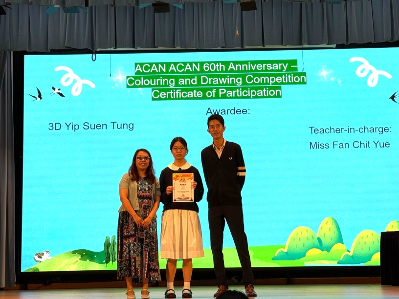 In 2024-2025, S.3 Yip Suen Tong joined the ACAN 60th Anniversary – Colouring and Drawing Competition organised by the 60th Anniversary of ACAN. She got the Certificate of Participation. Congratulations to her.