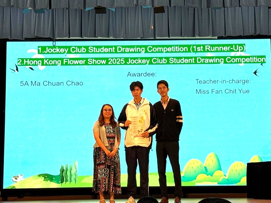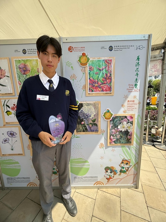 在2024-2025年度,S.5A馬傳超同學參加由康樂及文化事務署主辦的「香港花卉展覽2025賽馬會學童繪畫比賽」,並獲得亞軍。詳情請參看以下網址:https://www.hkflowershow.hk/tc/hkfs/2025/drawing.html# 恭喜馬同學!