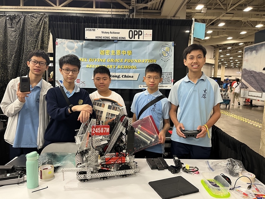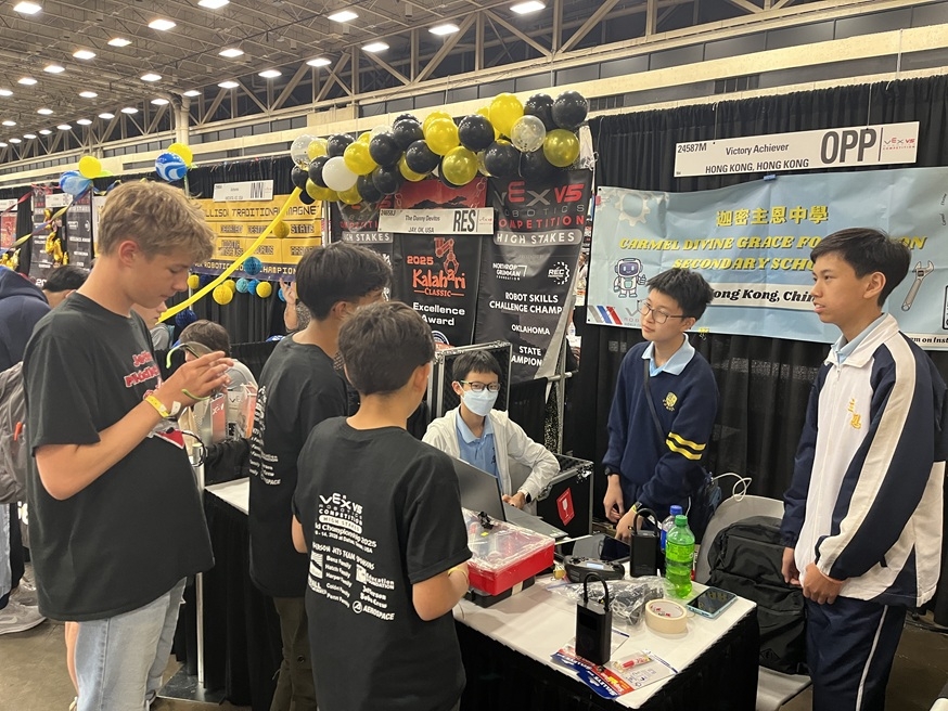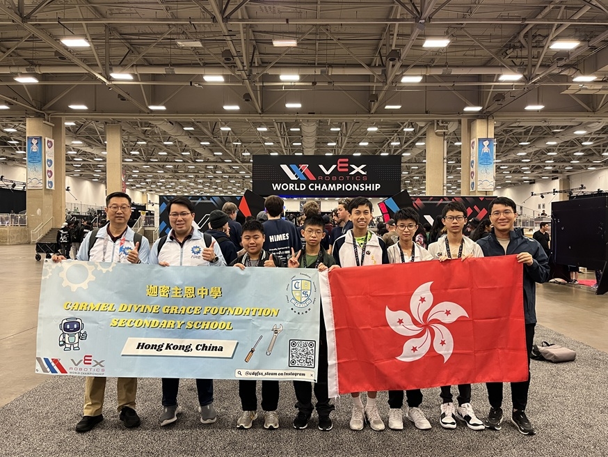 本校同學繼香港工程挑戰賽取得佳績後,其中一支初中隊伍獲選代表香港,在2025年5月9日至11日前往美國德州參加全球最大型的VEX機械人世界錦標賽(初中組)。這項國際賽事匯聚來自全球70多個國家及地區的400多支隊伍,讓學生有機會在世界級舞台上競技。同學亦在比賽過程中與來自不同地區的學生交流學習,擴闊視野,汲取寶貴經驗。