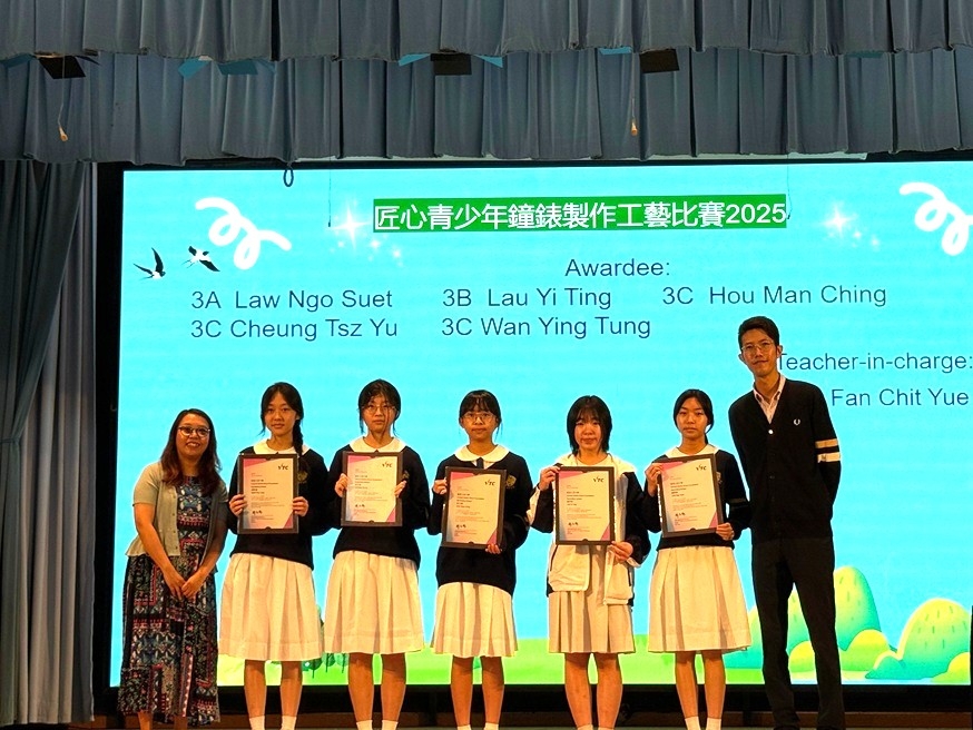 五名中三級學生參加由職業訓練局卓越培訓發展中心(精密工程業)主辦的「匠。心」青少年鐘錶製作工藝比賽,而温映潼與張芷瑜同學更進入決賽。恭喜兩位同學。